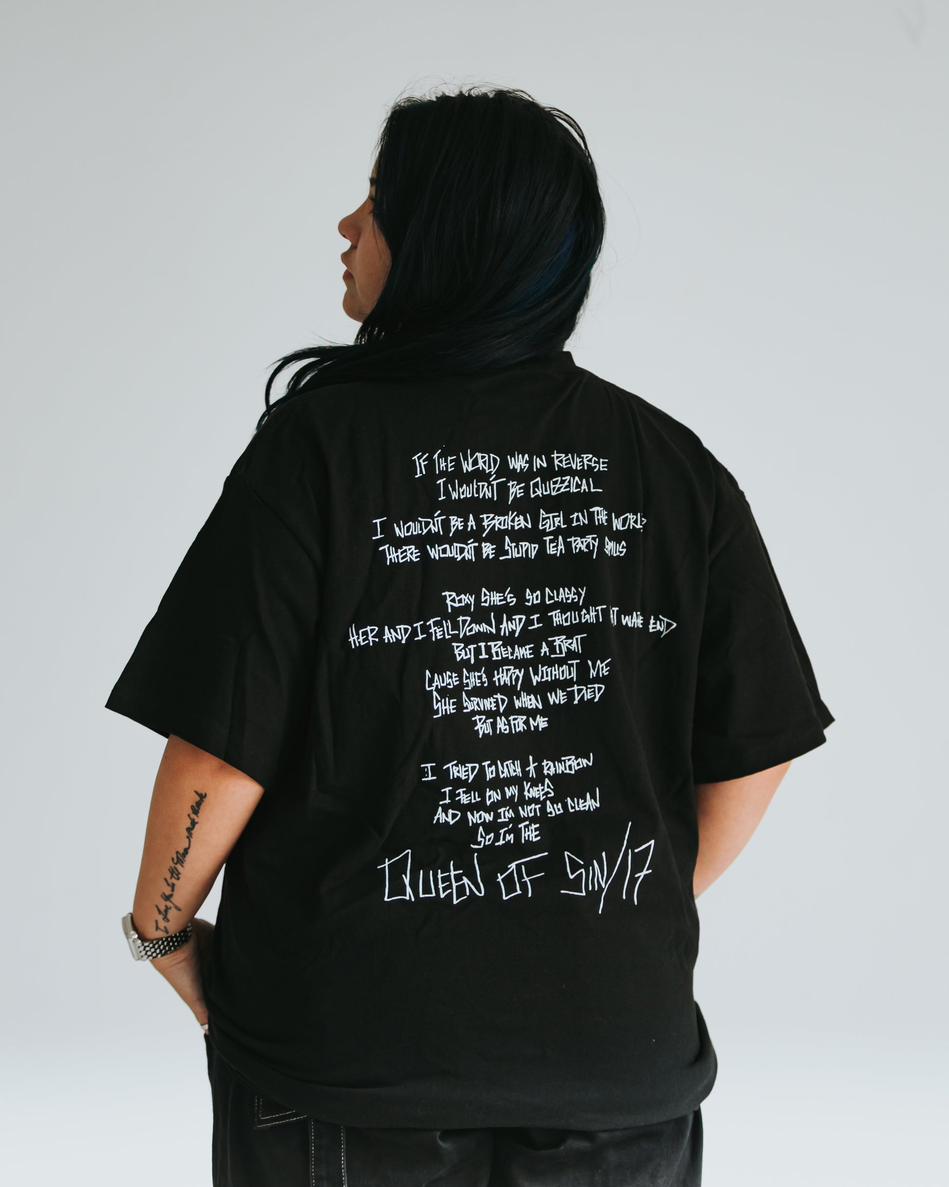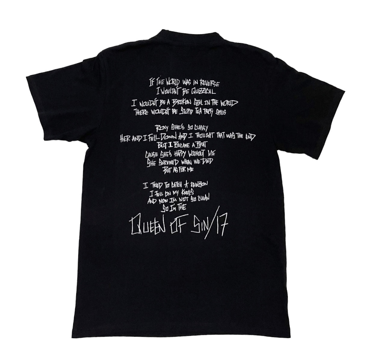 BACK PRINT IN SINGLE WHITE COLOR WITH WRITTEN OUT LYRICS FROM "QUEEN OF SIN/17"