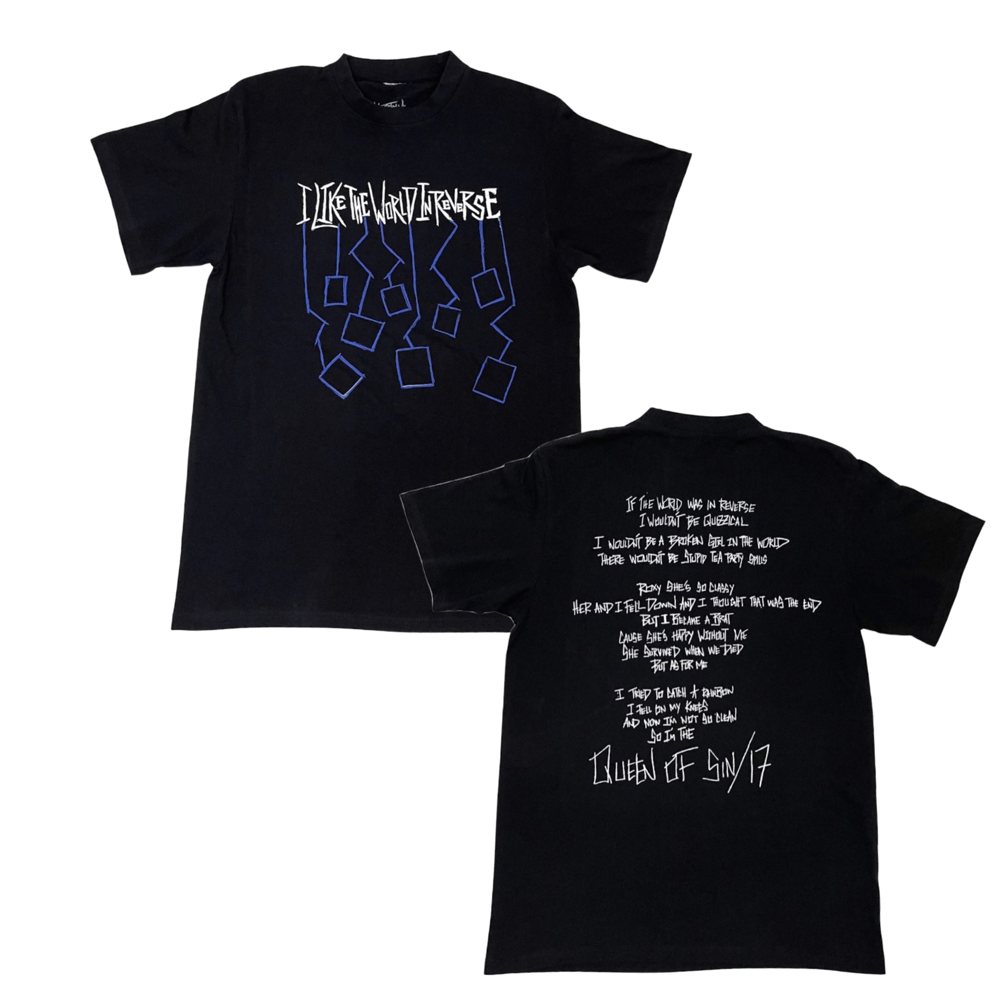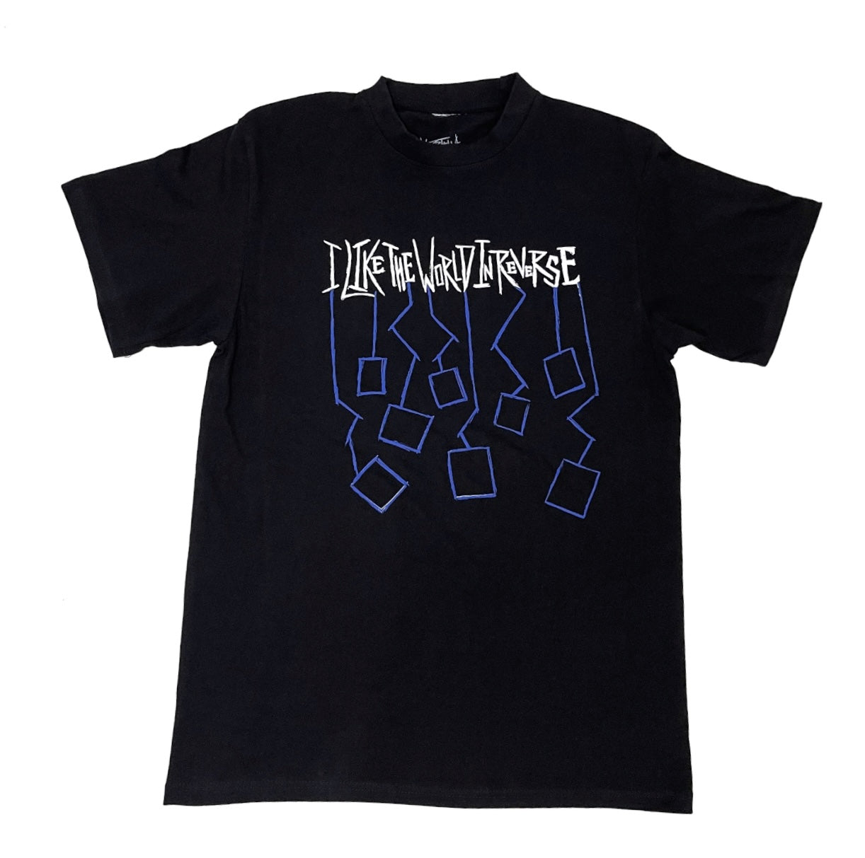 UNISEX BLACK TEE WITH SKETCH OF “I LIKE THE WORLD IN REVERSE" TITLE IN WHITE AND SUSPENDED BLUE TVS PRINTED ON FRONT CHEST